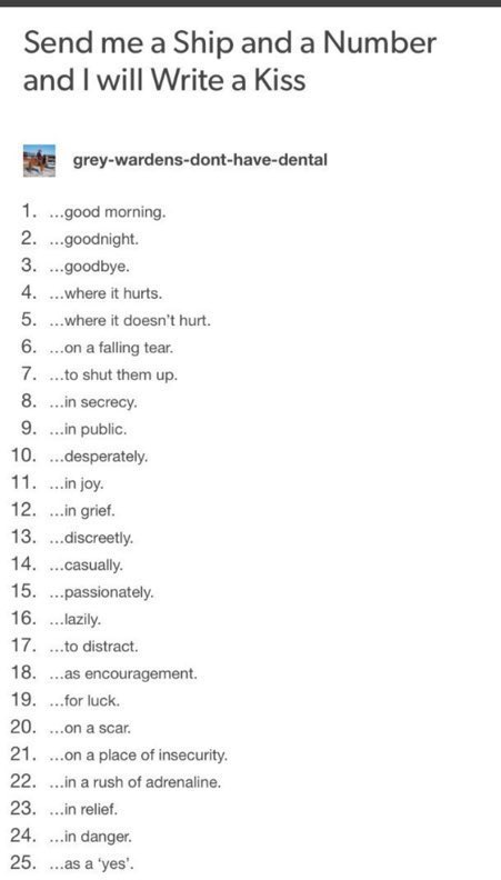 The kiss that made you want more. Hello Guys I know there are multip. How about 25 for kiss prompts 25. Be it from Tsukiuta SolidS Growth etc. For the kiss prompts maybe this with Zemo. Feel free to reblog of course. Read touching prompts 2 from the story a collection of writing prompts by y2kangelz leхιe with 2 reads. Person A getting frustrated when wrapping presents while Person B being able to quickly wrap beautiful presents and A being absolutely amazed and jealous. Read Kiss Prompts from the story Disney One Shots and Imagines by -Clint_Barton- Charlotte with 70 reads.